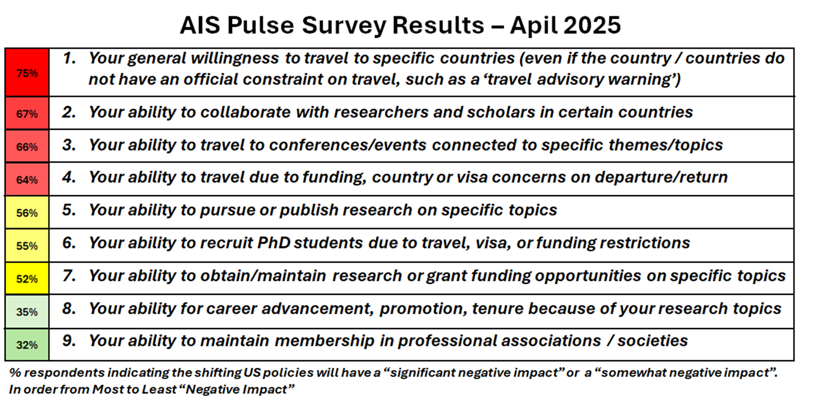 AIS has supported the Call for Constructive Engagement issued on April 12, 2025, with the American Association of Colleges and Universities (AAC&U). (https://www.aacu.org/newsroom/a-call-for-constructive-engagement).AIS re-affirms many of the statements by the American Association of University Professors (AAUP), including their Academic Freedom Field Guide (https://www.aaup.org/programs/academic-freedom/center-defense-academic-freedom/academic-freedom-field-guide) The survey showed that over half the respondents were concerned about their abilities to publish research on specific topics and to collaborate with researchers in certain countries. We stress that AIS journals and conferences are fully committed to supporting IS research in all its diversity. Research at AIS conferences and journals is accepted based on scientific merit alone and must not be affected in any way by any political preference. If you are conducting research on topics that have become politically sensitive, such as research on diversity, equity, inclusion, gender, healthcare, sustainability, social justice, your work is invited in all AIS venues, just as all other IS topics are welcome. Likewise, AIS Communities (e.g., SIGs and Colleges) are firmly committed to supporting collaborations across the world without restriction. The AIS has always sought to create an inclusive, developmental, and vibrant global community of IS scholarship, and we will strengthen these efforts even further in response to members’ concerns. If you continue to have concerns about these issues over time, please reach out to us.  The survey also revealed that many AIS members are concerned about research-related travel because of potential visa issues, political preferences regarding research topics, or general unease. We take these concerns seriously