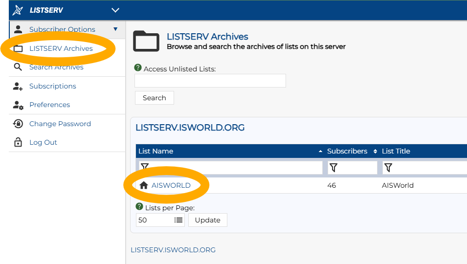 - Select the "LISTSERV Archives" tab, then select "AISWorld".