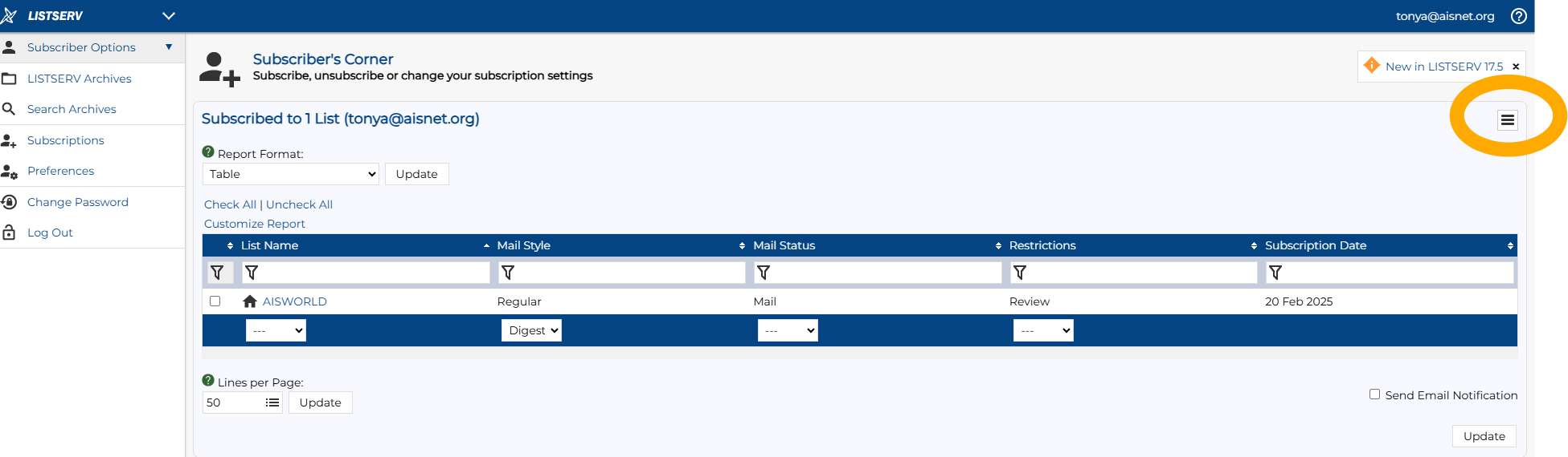 - In the 'Subscriber Options' tab, select the three horizontal bars on far right and choose "Subscribe or Unsubscribe"